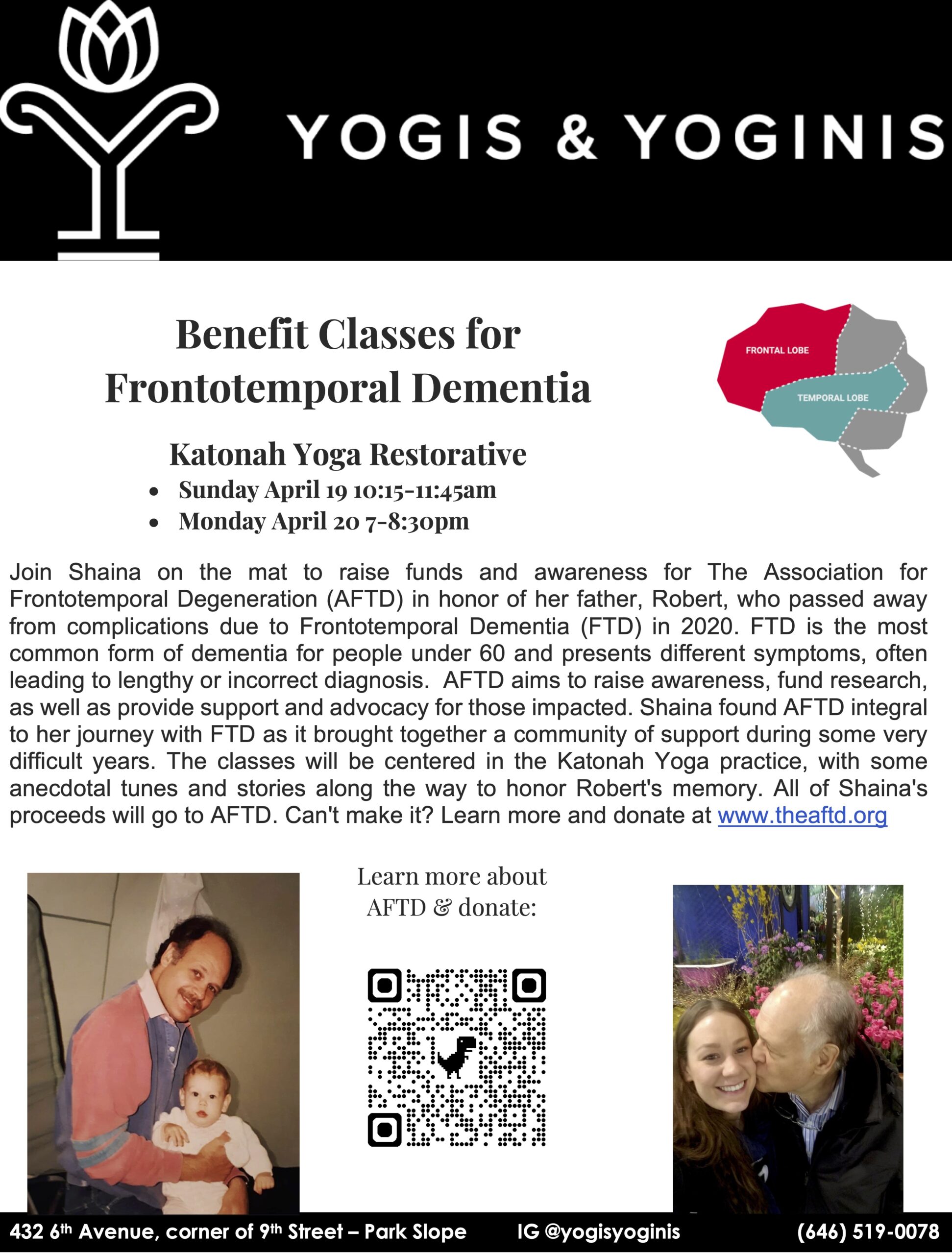 Join Shaina on the mat to raise funds and awareness for The Association for Frontotemporal Degeneration (AFTD) in honor of her father, Robert, who passed away from complications due to Frontotemporal Dementia (FTD) in 2020. FTD is the most common form of dementia for people under 60 and presents different symptoms, often leading to lengthy or incorrect diagnosis. AFTD aims to raise awareness, fund research, as well as provide support and advocacy for those impacted. Shaina found AFTD integral to her journey with FTD as it brought together a community of support during some very difficult years. The classes will be centered in the Katonah Yoga practice, with some anecdotal tunes and stories along the way to honor Robert’s memory. All of Shaina’s proceeds will go to AFTD. Can’t make it? Learn more and donate at www.theaftd.org